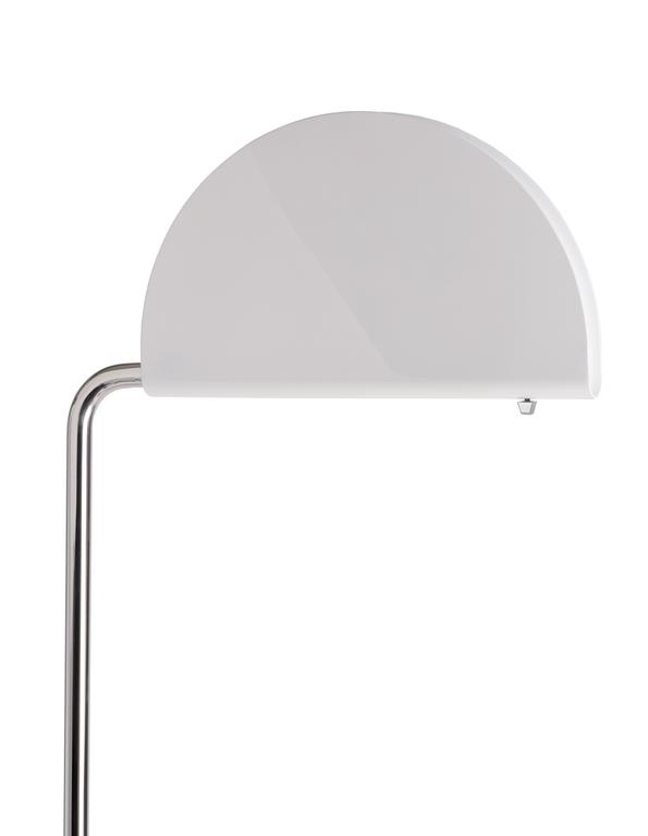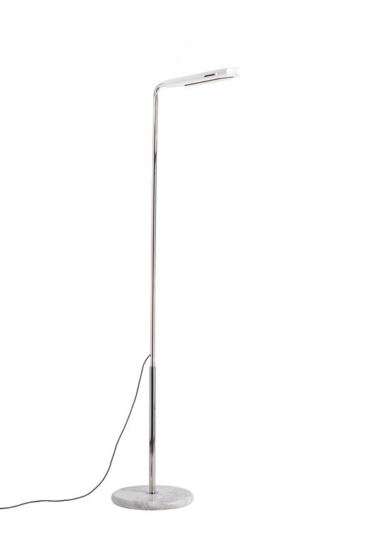 Den smukke gulvlampe har base i hvid marmor og stander med finish i krom og kan justeres i højden via et teleskopsystem. Skærmen i farvet aluminium kan vippes, så lysets retning kan ændres.