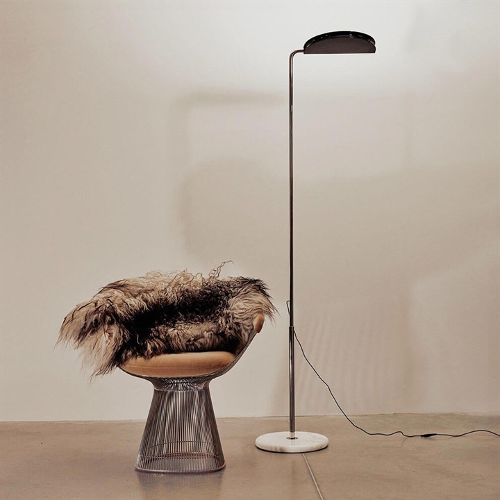 Den smukke gulvlampe har base i hvid marmor og stander med finish i krom og kan justeres i højden via et teleskopsystem. Skærmen i farvet aluminium kan vippes, så lysets retning kan ændres.