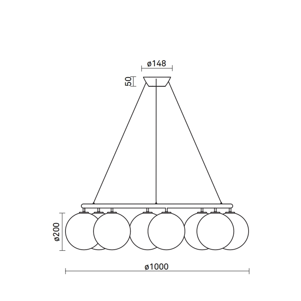 Miira 8 Circular med otte glaskupler har en diameter på 100 cm, Den større lysekrone er særligt egnet over det store spisebord eller som flot belysning i den store entre eller hall.