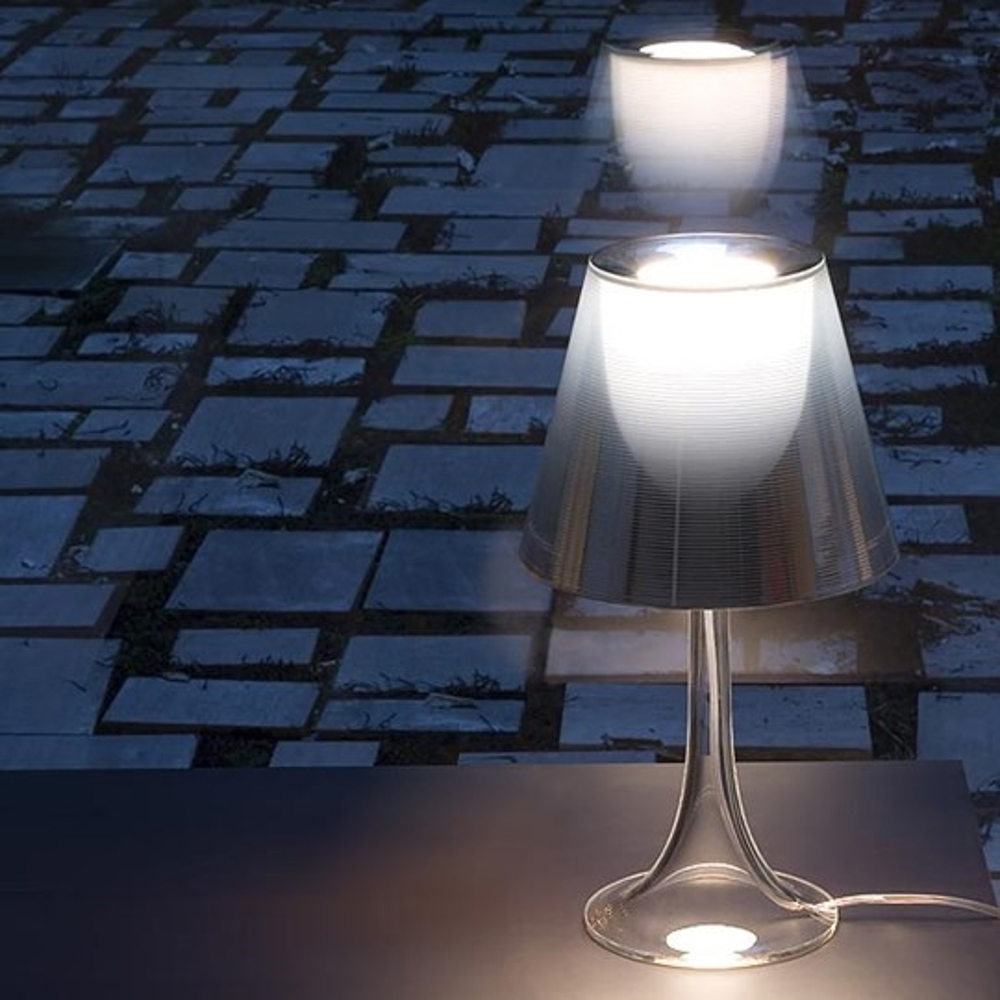 Moderne og smuk bordlampe i polykarbonat. Skærmen er aluminiumsbelagt indvendigt, hvilket giver minimal gennemlysning af yderskærmen. Dog med undtagelse af Miss K, T soft, der med det plisserede stofskærm giver et mere diffust lys.