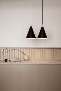 Lampeskærmens overflade består af mat malet stål, der flot kombineres af messingdetaljer, som bringer varme til lampen. De to kegleformet skærme får lyset til at vende nedad og giver et bredt lysspektrum under sig.