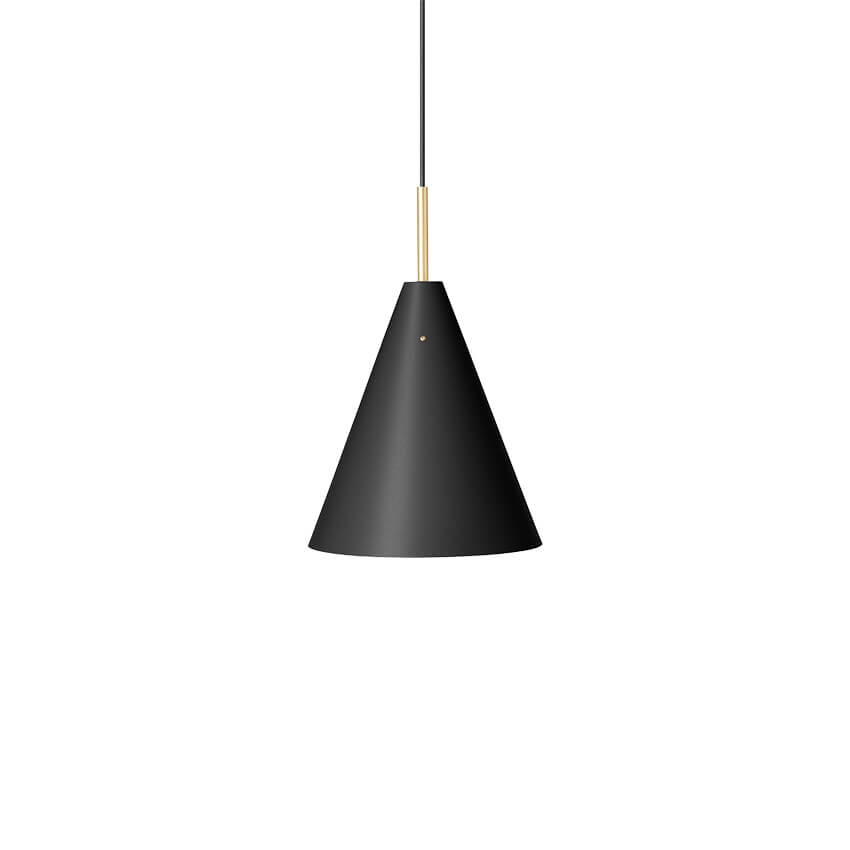 Lampeskærmens overflade består af mat malet stål, der flot kombineres af messingdetaljer, som bringer varme til lampen. Skærmens kegleform får lyset til at vende nedad.