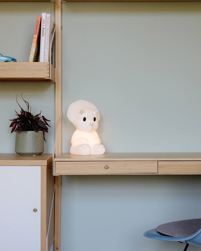 First Light serien består af søde dyre-lamper, der alle er gode venner, og som sammen hjælper ethvert barn med at skabe en hyggelig stemning på børneværelset. Mira er en sød dinosaur, som let kan tages med overalt.