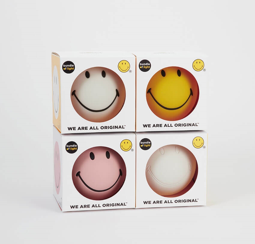 Smiley børnelampen findes i flere farver.