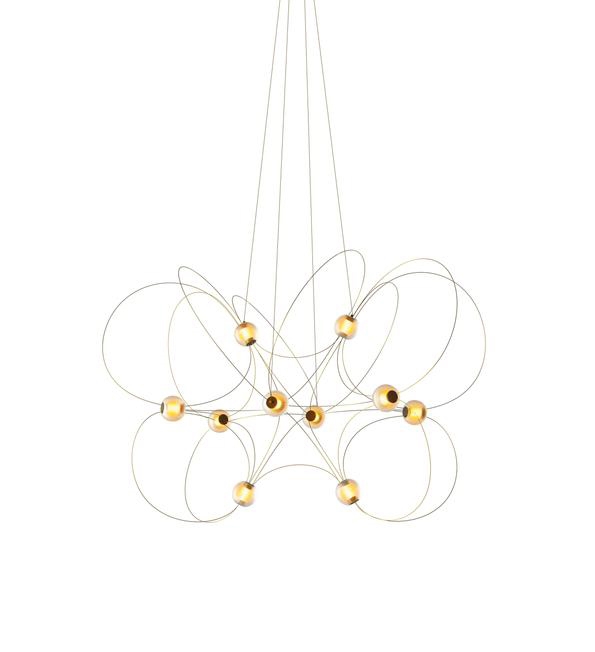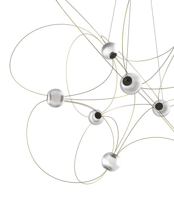 Lysekronen Munari med 10 kugleskærme er en skulpturel og grafisk tilføjelse til indretningen med et let og elegant design. Strukturen med en balance mellem stænger med finish i guld og lysende kugler med integreret LED-lyskilder leder tankerne hen på en konstellation af kosmiske planeter, lysende atomer eller magnetiske feltlinjer.
