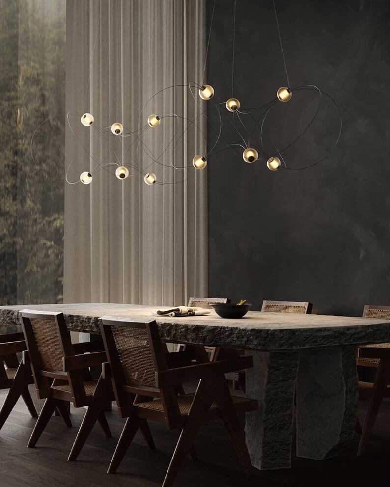 Munari udsender et kraftigt, men drømmeagtigt lys og findes med 6, 8 eller 10 kugleskærme og struktur i sort eller guld. Et oplagt valg til stuen og spisestuen eller en entré med højt til loftet.