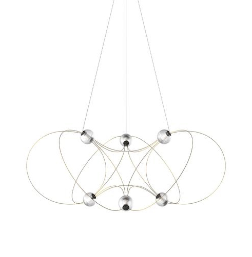 Lysekronen Munari med 6 kugleskærme er en skulpturel og grafisk tilføjelse til indretningen med et let og elegant design. Strukturen med en balance mellem stænger med finish i guld og lysende kugler med integreret LED-lyskilder leder tankerne hen på en konstellation af kosmiske planeter, lysende atomer eller magnetiske feltlinjer.