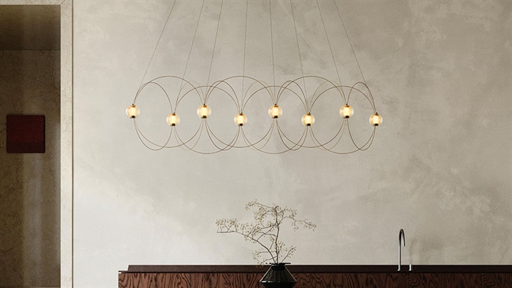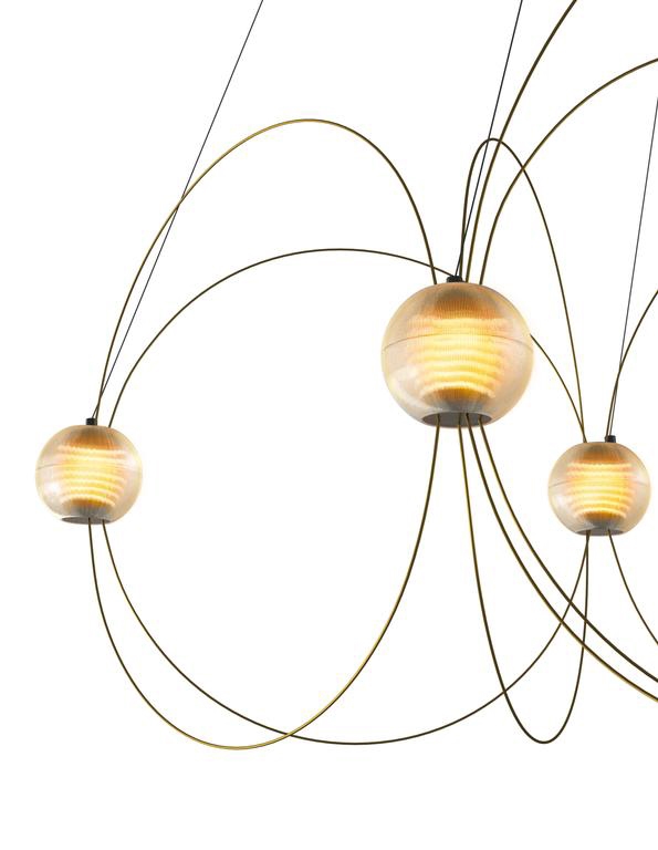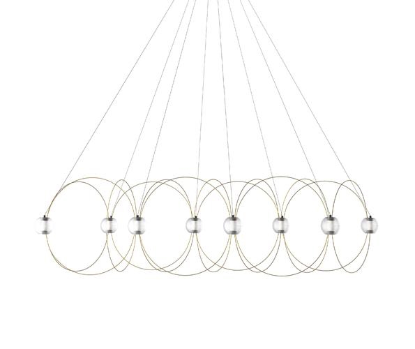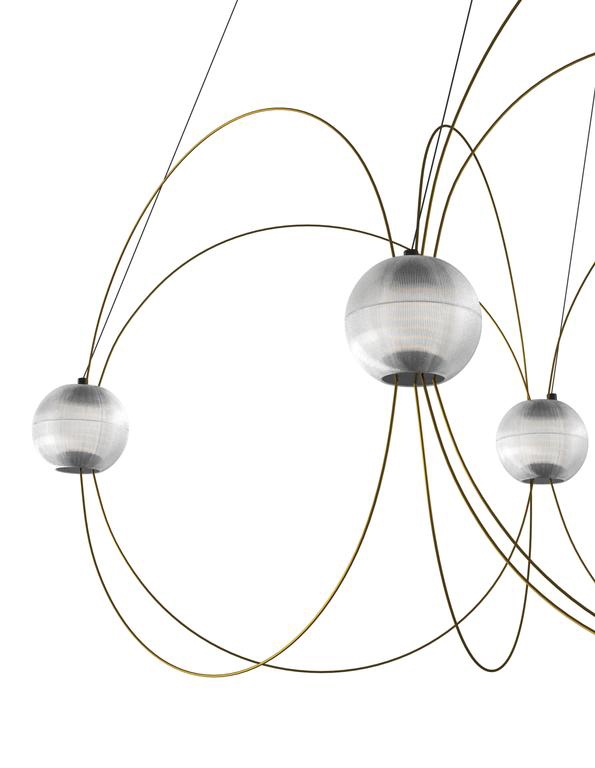 Lysekronen Munari med 8 kugleskærme er en skulpturel og grafisk tilføjelse til indretningen med et let og elegant design. Strukturen med en balance mellem stænger med finish i guld og lysende kugler med integreret LED-lyskilder leder tankerne hen på en konstellation af kosmiske planeter, lysende atomer eller magnetiske feltlinjer.