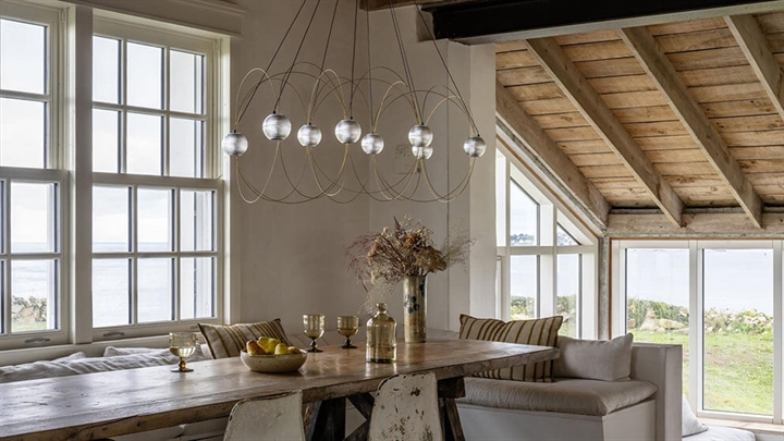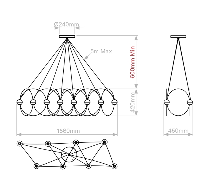 Munari udsender et kraftigt, men drømmeagtigt lys og findes med 6, 8 eller 10 kugleskærme og struktur i sort eller guld. Et oplagt valg til stuen og spisestuen eller en entré med højt til loftet.
