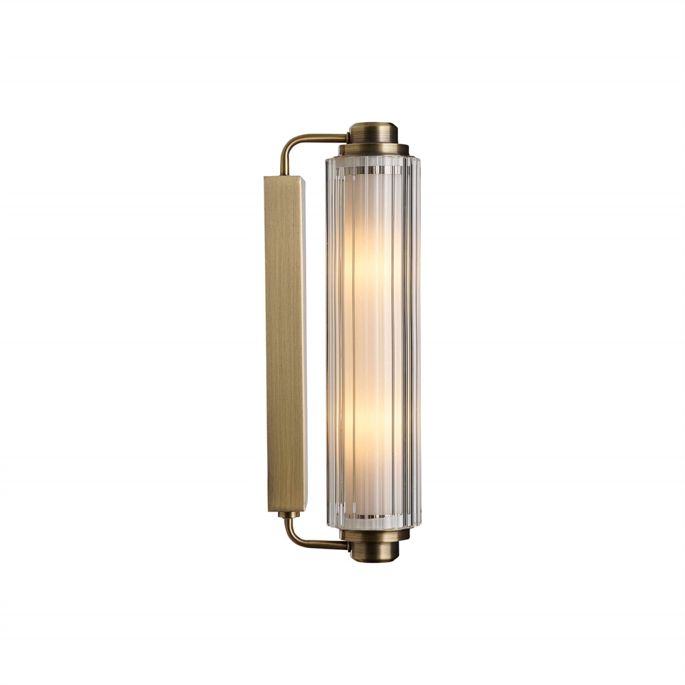 Væglampen Nimal Double med finish i messing er med sin IP44-klassificering velegnet til badeværelser og andre indendørs miljøer. Benyt eksempelvis den elegante lampe over eller ved siden af et spejl, hvor designet i Art Deco-stil med en smuk riflet skærm både vil være dekorativt og sikre et behageligt lys.