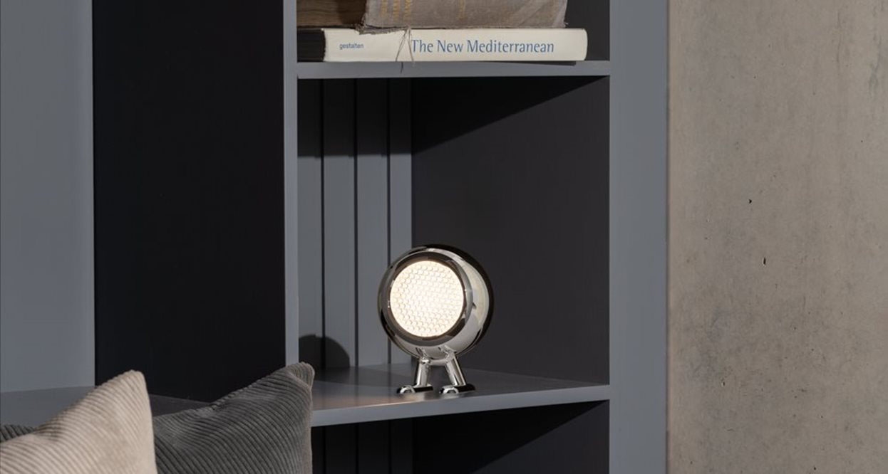 Batterilampen Norbitt med finish i krom er en trofaste lille ven, der spreder god atmosfære både indendørs og udendørs. Den genopladelige lampe kan rotere lampehovedet 360° og har et kompakte design, der passer godt på bordet, reolen og i vindueskarmen eller på natbordet i soveværelset eller børneværelset.