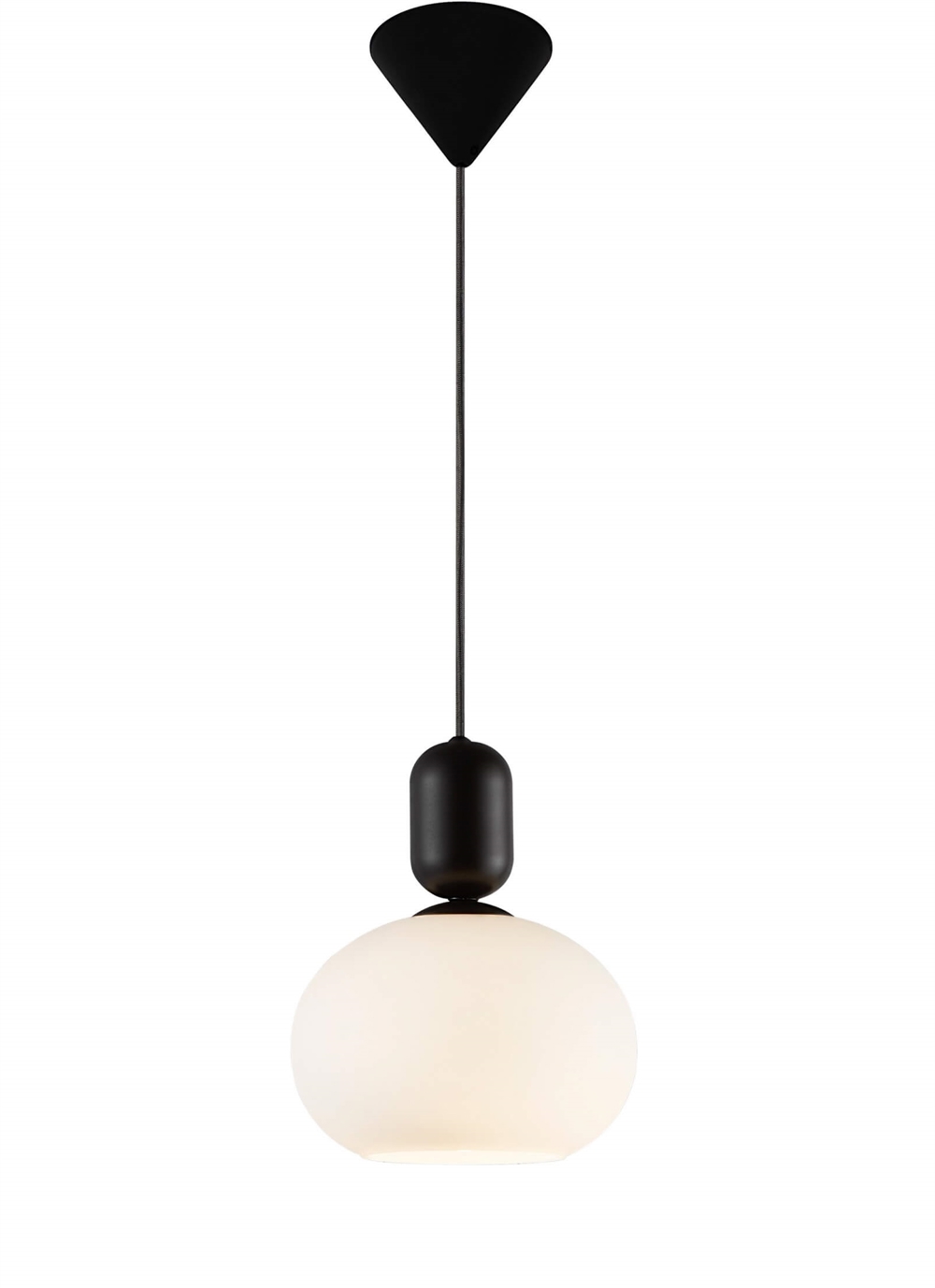 Den hvide opalskærm sikrer et blødt og blændfrit lys, der spreder en behagelig atmosfære i rummet. Toppens matte metaloverflade skaber en flot visuel kontrast til skærmen og giver pendlen et moderne udtryk.