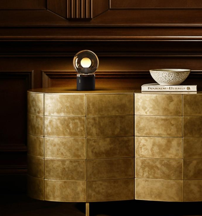Luna Pura er transportabel og nem at tage med sig. Den udsender et blødt og blændfrit lys fra Occhio fireball-optikken i midten af lampens kugleformede glasskærm. Basen er i mat sort og afsluttes før glasskærmen med en top i gold.