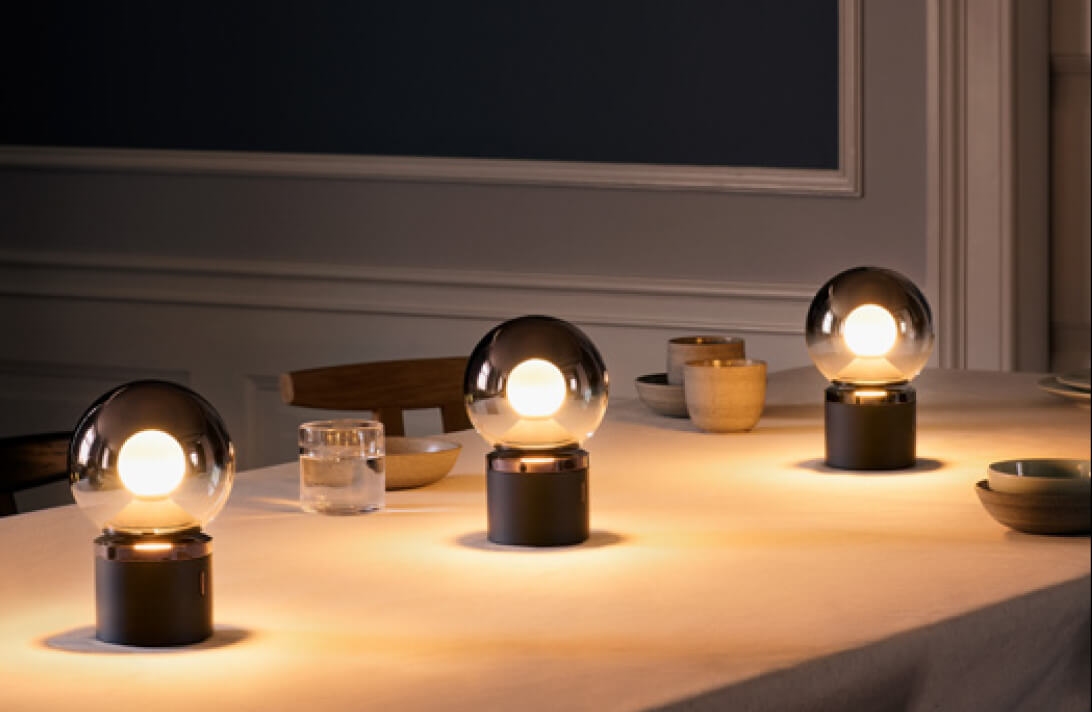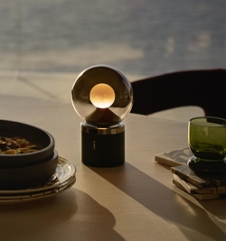Luna Pura er transportabel og nem at tage med sig. Den udsender et blødt og blændfrit lys fra Occhio fireball-optikken i midten af lampens kugleformede glasskærm. Basen er i mat sort og afsluttes før glasskærmen med en top i phantom.