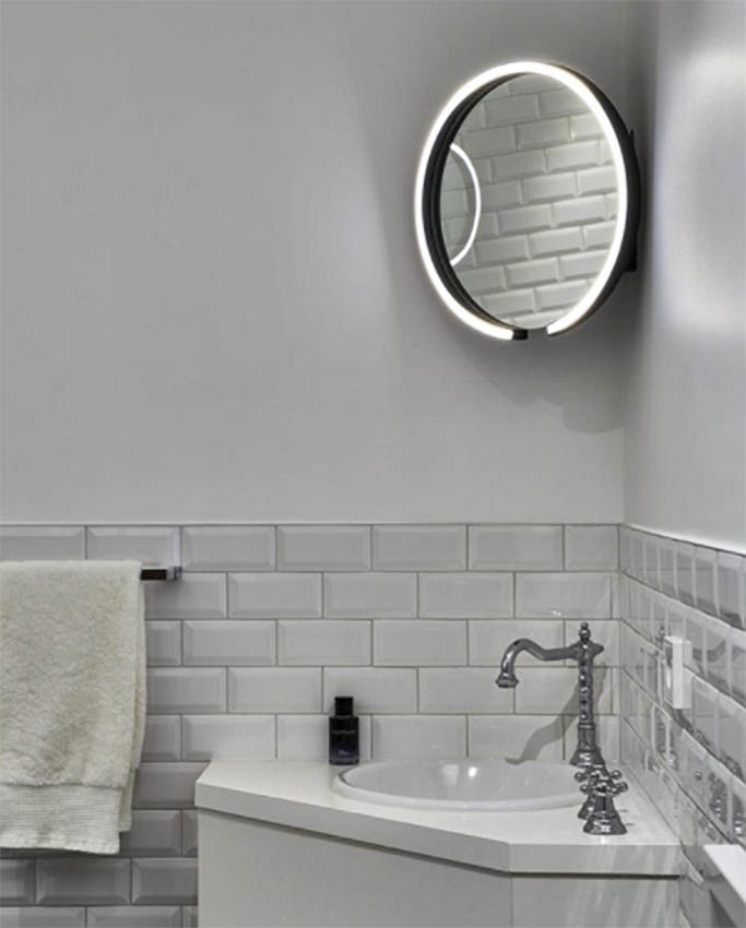 Denne variant af Mito sfera består af spejl og lampe i én enhed, hvilket sikrer en blændfri og fantastisk belysning af ansigtet.