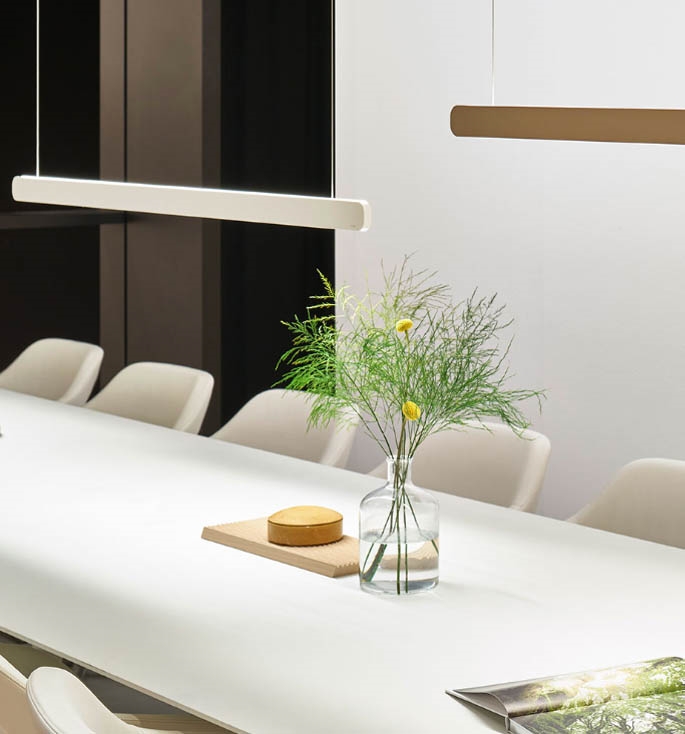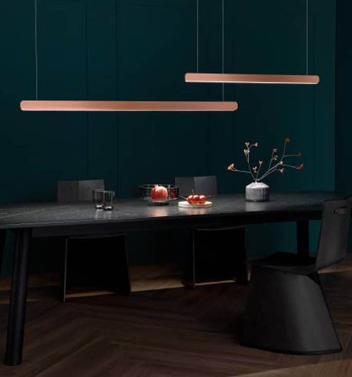 Mito Volo giver et enestående dobbeltsidet lys, så det både oplyser bordet, men også rummet. Lampen kan monteres med variabel højde 65-165 cm.