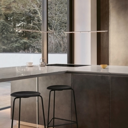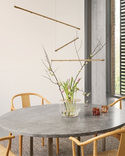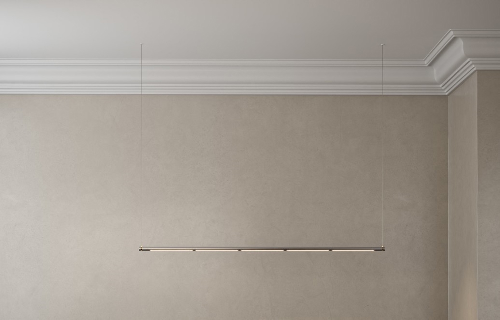 Oneline er inspireret af de rene former i Poul Kjærholms møbeldesign. Den unikke pendel fås i rustfrit stål, børstet messing eller i sort PVD. Lampen og lyskilden kan roteres 360 grader og fremstår, med sine strømførende wires, ledningsfri og svævende i luften.