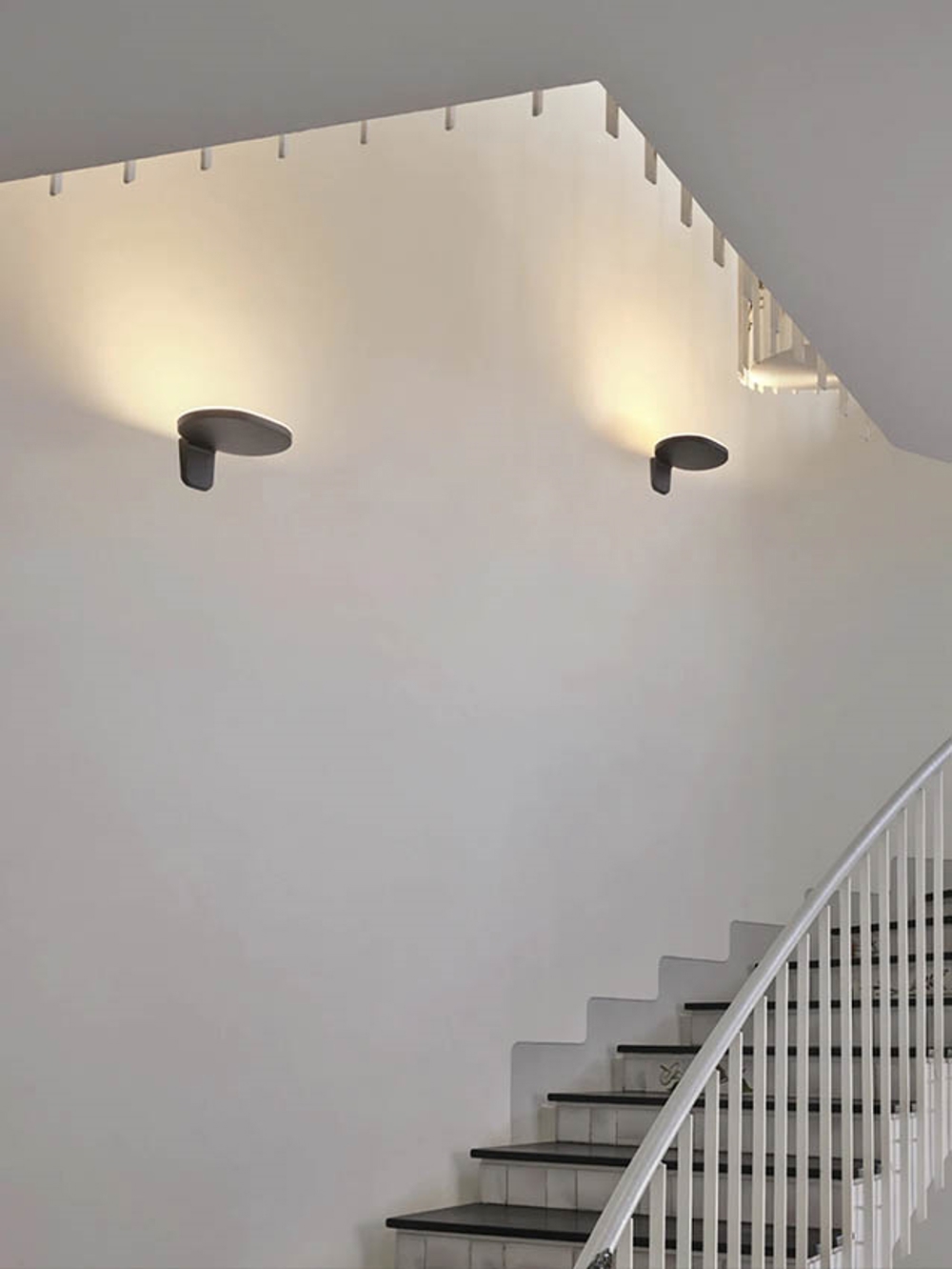 Oplight væglampen findes i antrasit, hvid, metallisk grå og sort i to størrelser.