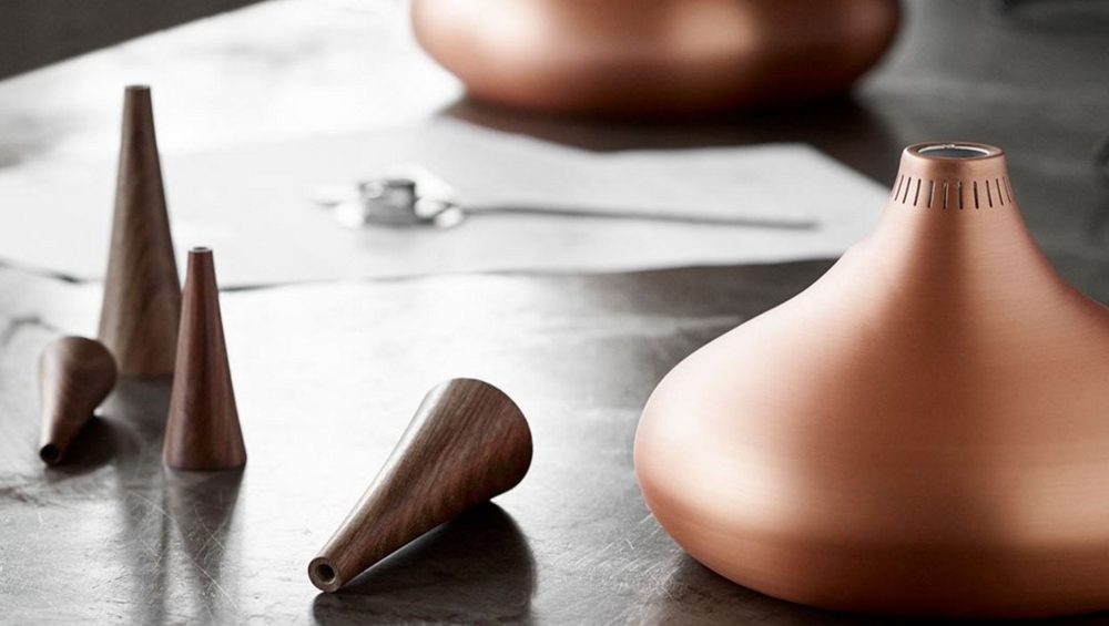 Den klassiske pendel genopstår fuldstændig tro mod originalen i to pendelstørrelser Ø225 og Ø340 mm. Det organiske formsprog forener smukt den dybe levende kobberglød med toppen i rosentræ. Fra rosentræets mørke årer skabes en naturlig forbindelse til den sorte tætvævede tekstilledning. Lampen har 21/24 smalle, vertikale slidser i toppen af den ægte kobberskærm, som tillader lys at slippe ud. Armaturet skjuler elegant lavenergilyskilden og sikrer et behageligt blødt lys uden blænding.