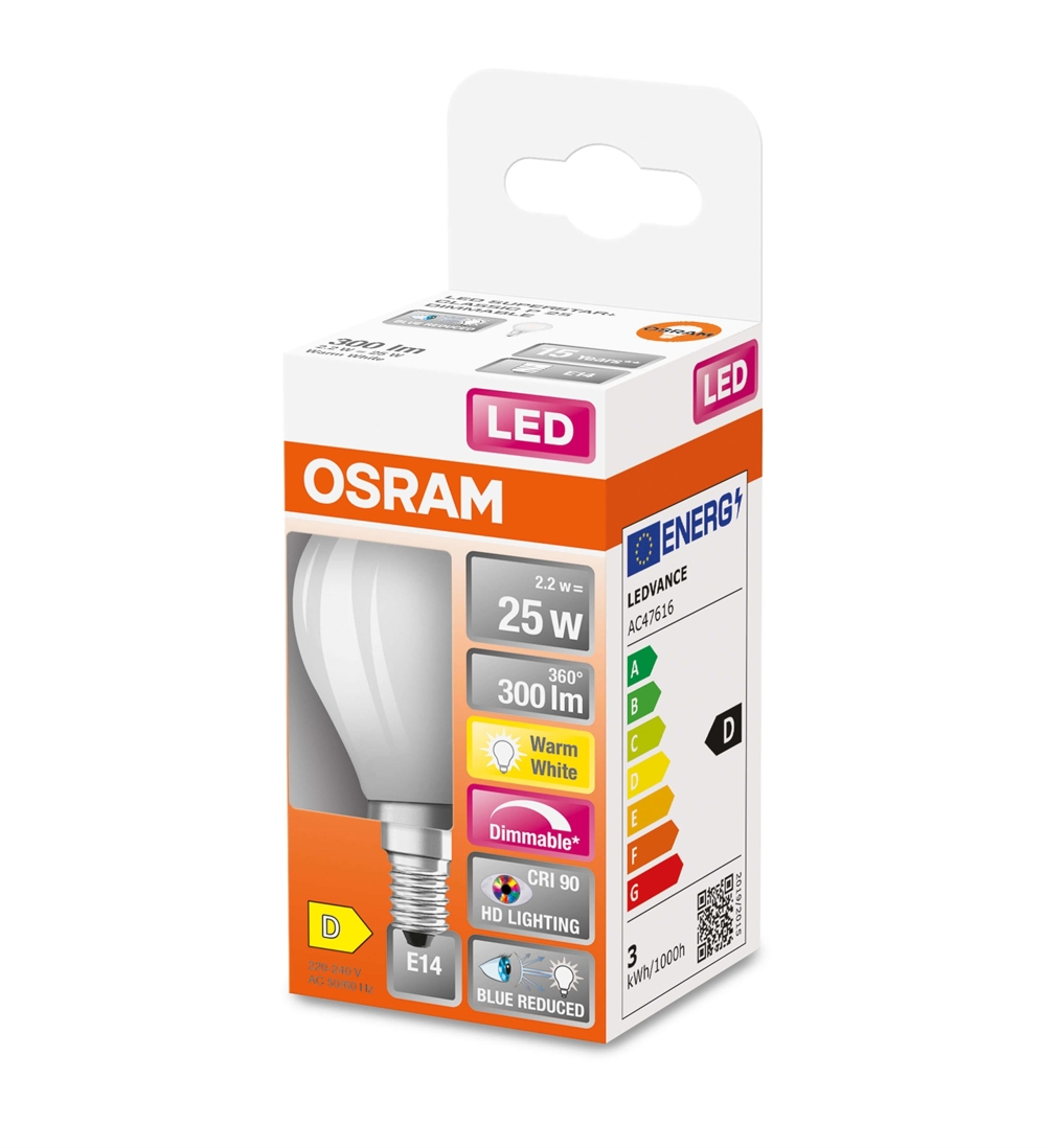 Osram dæmpbar LED-pære med E14-sokkel 2,2W 927 (300lm - 2700K - 15000 timer), mat