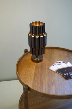 Bordlampen Pan 120 er et smukt og dekorativt design fra Bent Karlby inspireret af panfløjten. Designet er bygget op af blanke lysrør i anodiseret aluminium med bronzefinish, som passer godt til mange moderne indretninger.