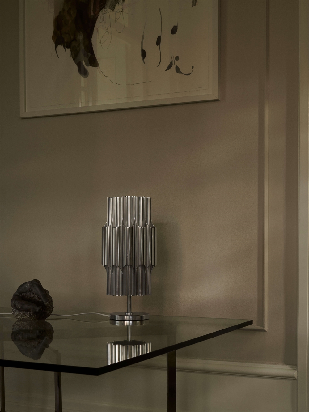 Bordlampen Pan 190 er et smukt og dekorativt design fra Bent Karlby inspireret af panfløjten. Designet er bygget op af blanke lysrør i anodiseret aluminium, som passer godt til mange moderne indretninger.