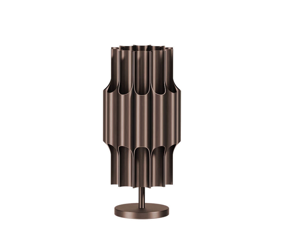 Bordlampen Pan 190 er et smukt og dekorativt design fra Bent Karlby inspireret af panfløjten. Designet er bygget op af blanke lysrør i anodiseret aluminium med bronzefinish, som passer godt til mange moderne indretninger.