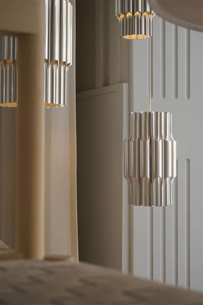Den ikonisk pendel består af aluminiumsrør, der flot lyses op af de åbne rør. Lysrørene får lyset til at vende både opad og nedad. Det opadgående lys sikrer et diskret omgivende lys, mens det nedadgående lys sikrer funktionel og behagelig belysning.