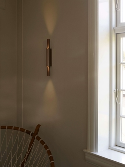 Væglampen Pan 38 er et smukt og dekorativt design fra Bent Karlby inspireret af panfløjten. Lampen giver et flot lysspil på væggen via åbningerne i top og bund af det blanke lysrør i anodiseret aluminium med bronzefinish. De to lyskilder sikrer et ensartet blødt lys fra top og bund.