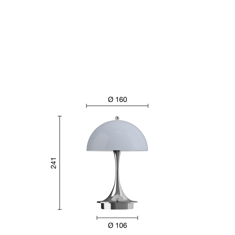 Denne Panthella har base i krom og skærm i blågrå opal. Det er V3-modellen af Panthella 160 Portable, som er lanceret i 2024. I forhold til tidligere modeller er V3-modellen blandt andet forbedret med længere batteritid og har fået lyskontrollen indbygget i knoppen på toppen af skærmen, hvor dæmpning og tænd/sluk-funktionen tidligere var på basen.