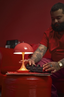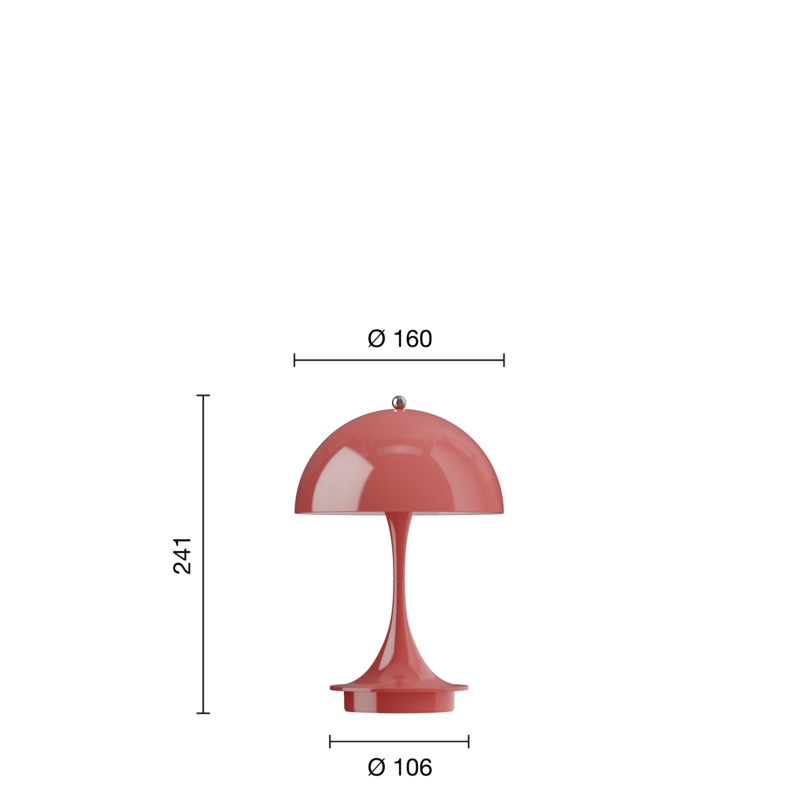 Denne Panthella har base og ugennemsigtig skærm i koral. Det er V3-modellen af Panthella 160 Portable, som er lanceret i 2024. I forhold til tidligere modeller er V3-modellen blandt andet forbedret med længere batteritid og har fået lyskontrollen indbygget i knoppen på toppen af skærmen, hvor dæmpning og tænd/sluk-funktionen tidligere var på basen.
