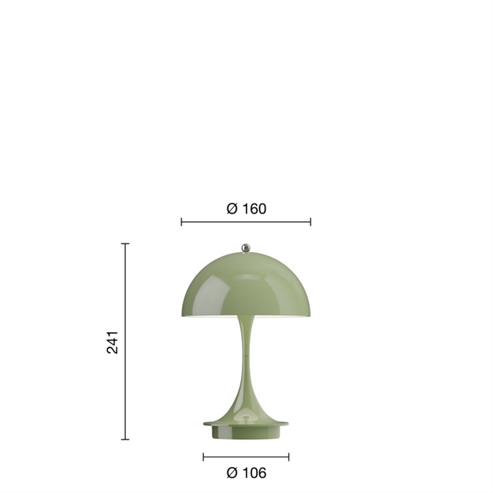 Denne Panthella har base og ugennemsigtig skærm i grøn. Det er V3-modellen af Panthella 160 Portable, og denne farvevariant er lanceret i 2025. I forhold til tidligere modeller er V3-modellen blandt andet forbedret med længere batteritid og har fået lyskontrollen indbygget i knoppen på toppen af skærmen, hvor dæmpning og tænd/sluk-funktionen tidligere var på basen.