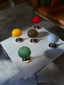 Panthella 160 Portabel V3 findes med flere forskellige finish. Varianterne med de originale Panthella-farver fra 1970'erne har opalskærme i grøn, orange, rød, brun eller blågrå.