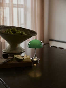 Louis Poulsen Panthella 160 Portable V3 bordlampe/batterilampe, krom/original grøn opal - designet af Verner Panton