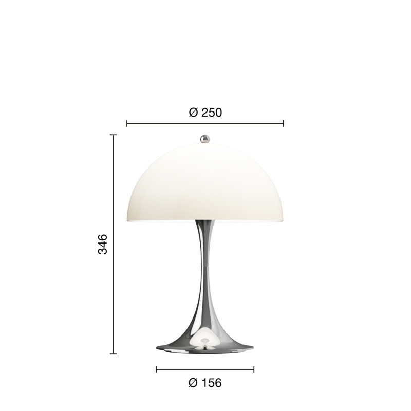 Denne Panthella har base i krom og skærm i beige opal. Det er V3-modellen af Panthella 250 Portable, som er lanceret i 2025. I forhold til tidligere modeller er V3-modellen blandt andet forbedret med længere batteritid og en funktion, der beskytter batteriet, hvis man bruger lampen, mens den er tilsluttet stikkontakten. Endvidere har den nye model fået tænd/sluk-funktionen indbygget i knoppen på toppen af skærmen, hvor den tidligere var på basen.