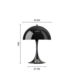 Denne Panthella har base og ugennemsigtig skærm i sort. Det er V3-modellen af Panthella 250 Portable, som er lanceret i 2025. I forhold til tidligere modeller er V3-modellen blandt andet forbedret med længere batteritid og en funktion, der beskytter batteriet, hvis man bruger lampen, mens den er tilsluttet stikkontakten. Endvidere har den nye model fået tænd/sluk-funktionen indbygget i knoppen på toppen af skærmen, hvor den tidligere var på basen.