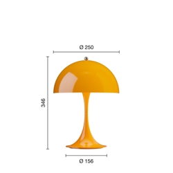 Denne Panthella har base og ugennemsigtig skærm i orange. Det er V3-modellen af Panthella 250 Portable, som er lanceret i 2025. I forhold til tidligere modeller er V3-modellen blandt andet forbedret med længere batteritid og en funktion, der beskytter batteriet, hvis man bruger lampen, mens den er tilsluttet stikkontakten. Endvidere har den nye model fået tænd/sluk-funktionen indbygget i knoppen på toppen af skærmen, hvor den tidligere var på basen.