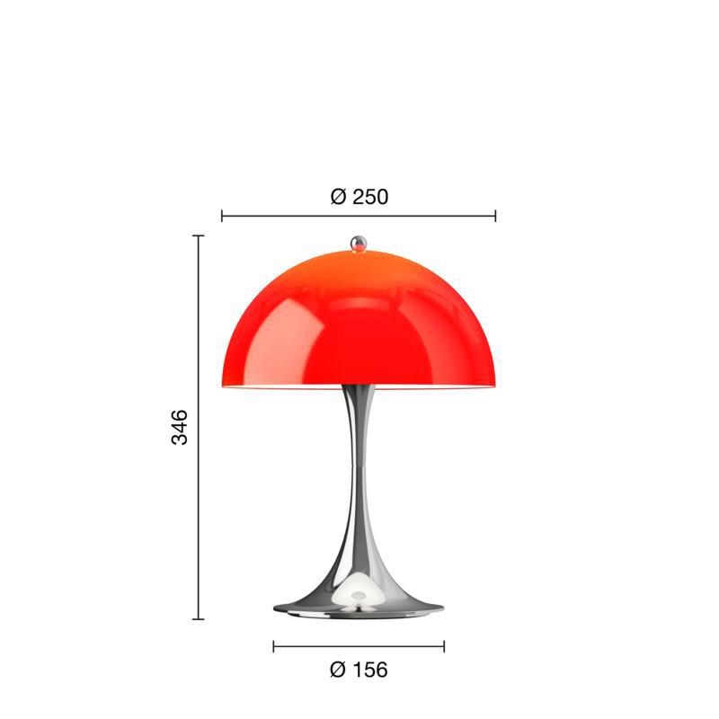 Denne Panthella har base i krom og skærm i rød opal. Det er V3-modellen af Panthella 250 Portable, som er lanceret i 2025. I forhold til tidligere modeller er V3-modellen blandt andet forbedret med længere batteritid og en funktion, der beskytter batteriet, hvis man bruger lampen, mens den er tilsluttet stikkontakten. Endvidere har den nye model fået tænd/sluk-funktionen indbygget i knoppen på toppen af skærmen, hvor den tidligere var på basen.
