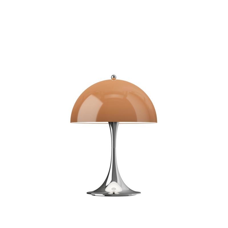 Denne Panthella har base i krom og skærm i brun opal. Det er V3-modellen af Panthella 250 Portable, som er lanceret i 2025. I forhold til tidligere modeller er V3-modellen blandt andet forbedret med længere batteritid og en funktion, der beskytter batteriet, hvis man bruger lampen, mens den er tilsluttet stikkontakten. Endvidere har den nye model fået tænd/sluk-funktionen indbygget i knoppen på toppen af skærmen, hvor den tidligere var på basen.