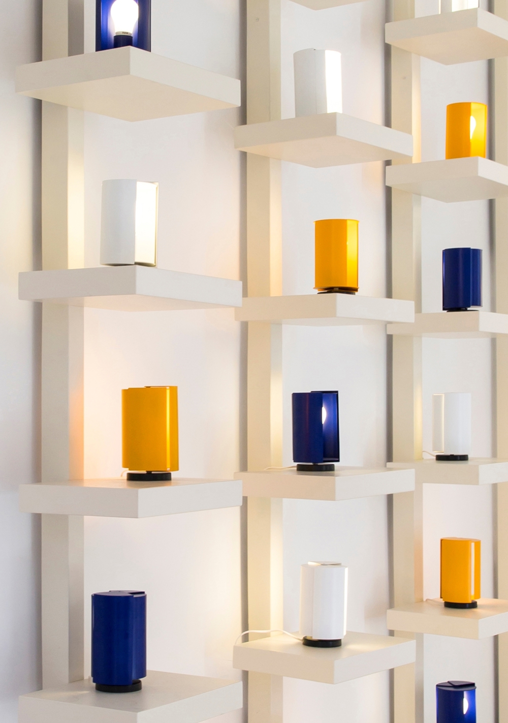 Pivotante À Poser bordlampen er cylinderformet bordlampe med skærme af bøjet metalplader i farverne; gul, blå eller hvid. Basen på bordlampen er i mat grå farvet aluminium.