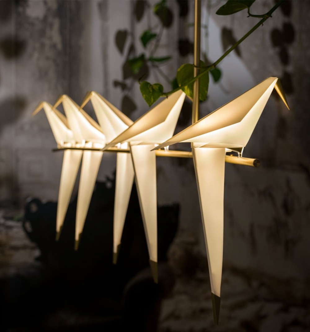 Perch Light Branch består af 5 abstrakte fugle, som giver en smuk glød til rummet. Hvis man let rører fuglene, kan de svinge, hvilket giver dem endnu mere liv.