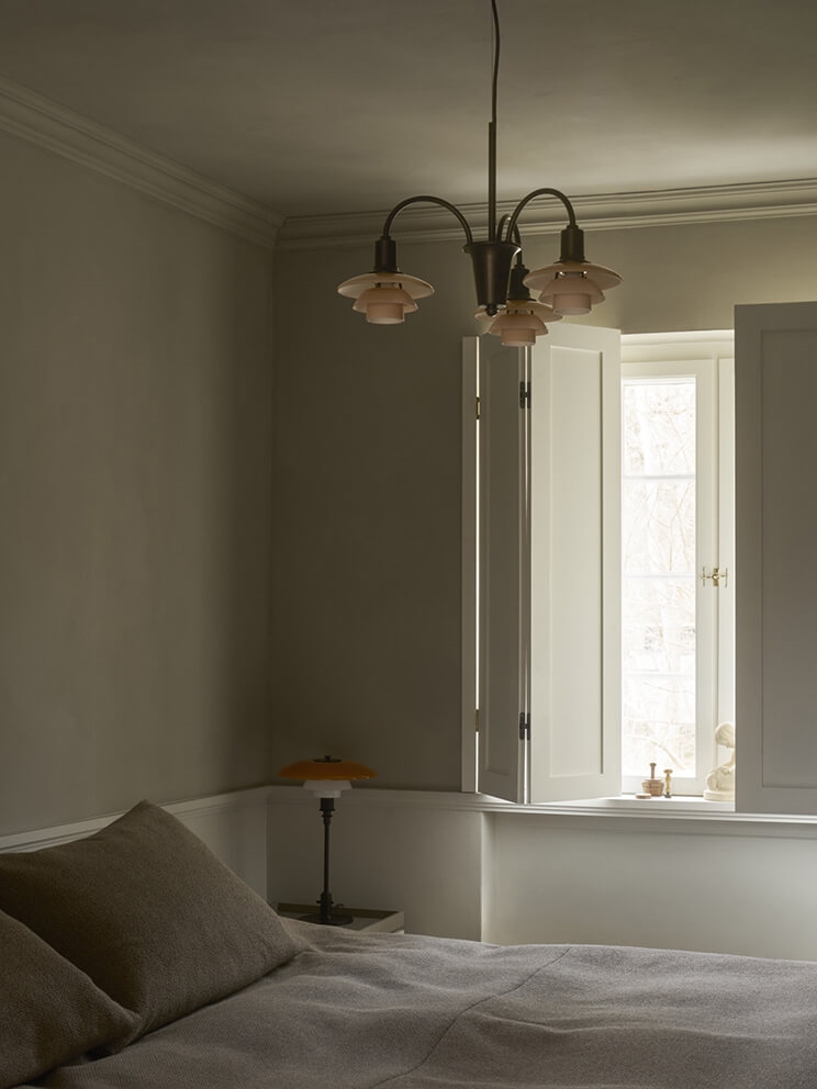 Denne Centenary Edition af lampen i lakeret aged brass med glasskærme i dusty terracotta er introduceret i 2026 for at markere 100-året for Poul Henningsens treskærmssystem fra 1926. Systemet - der også er kendt som System PH - er bygget op af tre skærme, der kan kombineres til mange forskellige lamper og giver en fuldstændig blændfri fordeling af lyset.