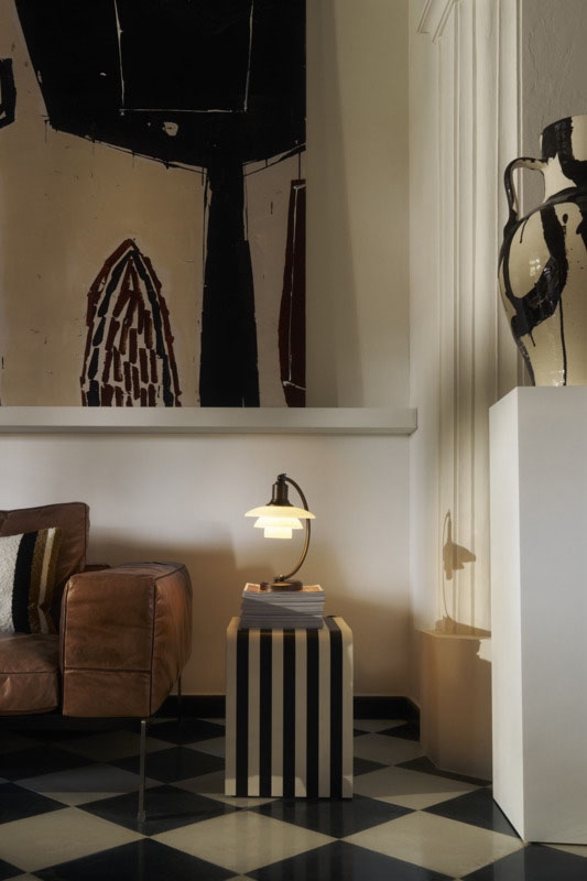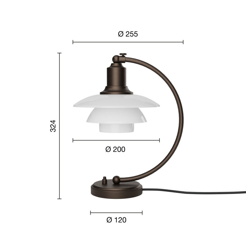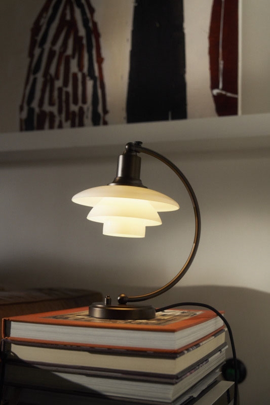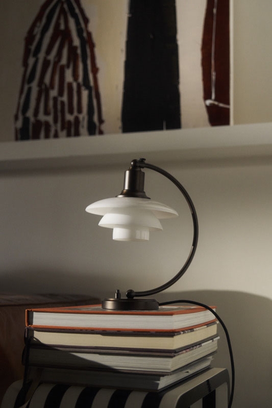 Den smukke PH bordlampe 2/2 Luna i bruneret messing med mundblæste 3-lags opalglasskærme er en del af Louis Poulsen Aged Brass-kollektion lanceret i 2025. Kollektionen omfatter PH 2/2 Luna bordlampen, PH 3/2 bordlampen og PH 3/3 pendlen og er en hyldest til skaberen Poul Henningsen og lampernes tidløse design og exceptionelt håndværk.