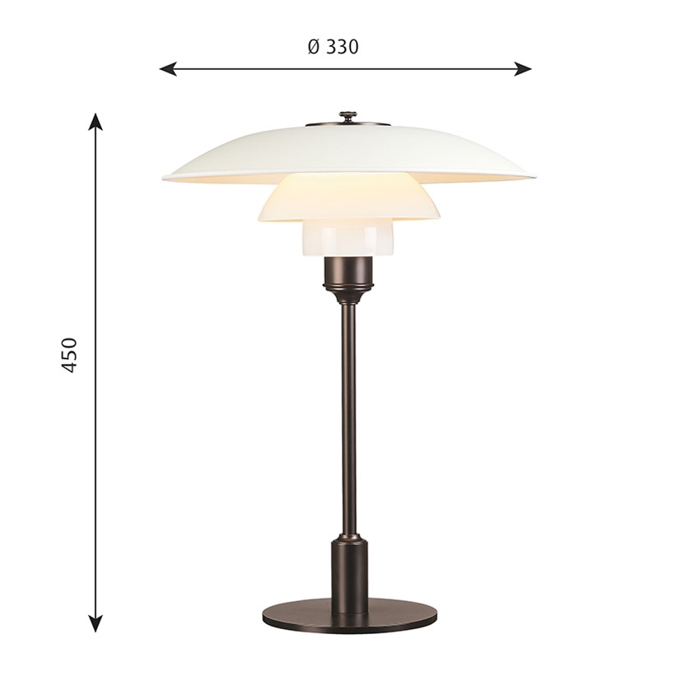PH-lampenummeret refererer til lampeskærmenes størrelse. Derfor består PH 3½-2½ bordlampen af en overskærm på ca. 35 cm og underskærme som er fra 2½ versionen.