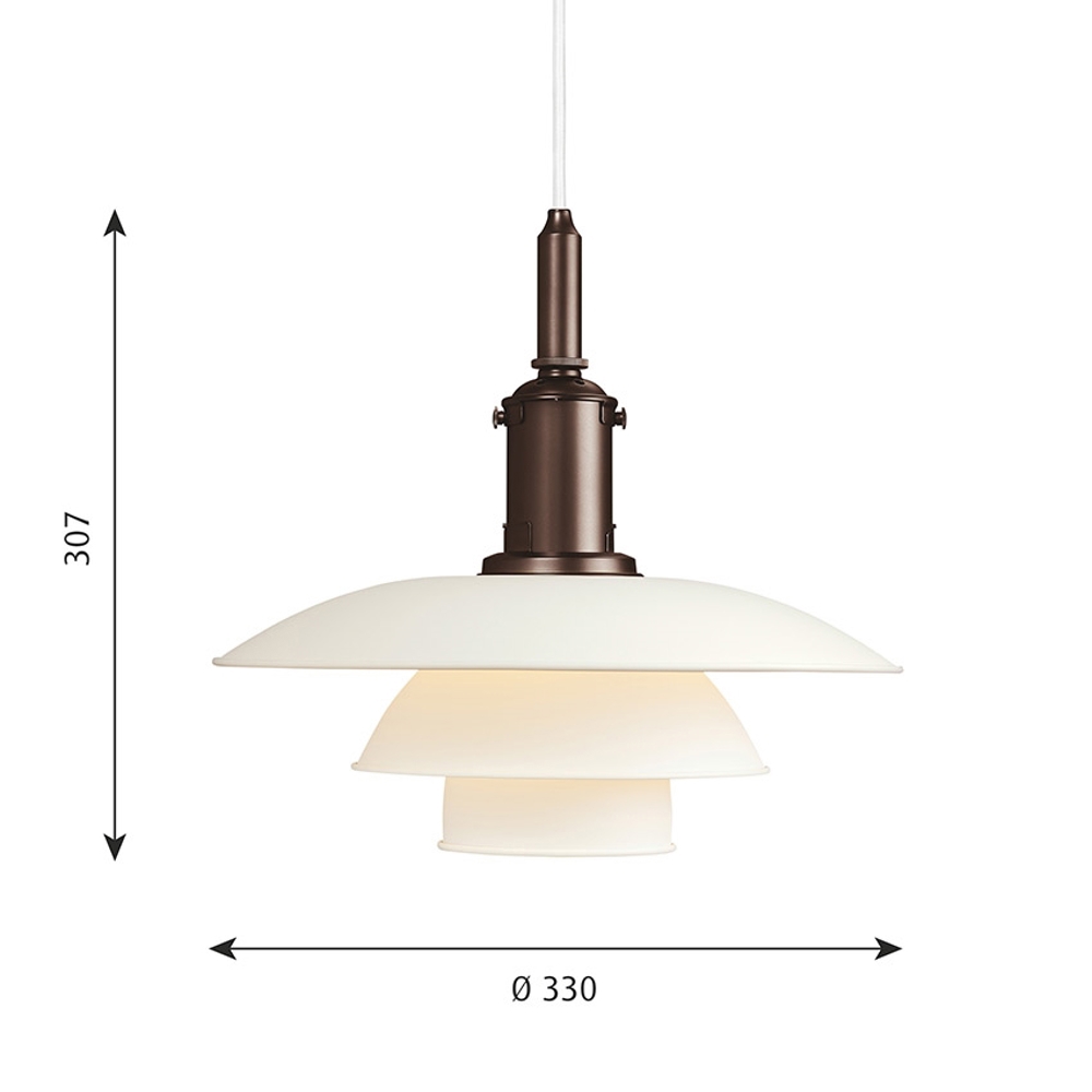 PH-lampenummeret refererer til lampeskærmenes størrelse. Derfor består PH 3½-3 pendlen af en overskærm på ca. 35 cm og underskærme som er fra 3/3 versionen.