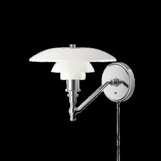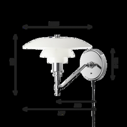 Denne variant af PH 3/2 væglampen er med ledning. Væglampens arm er af højglansforkromet messing, og beslaget er af højglansforkromet optrukket messing.