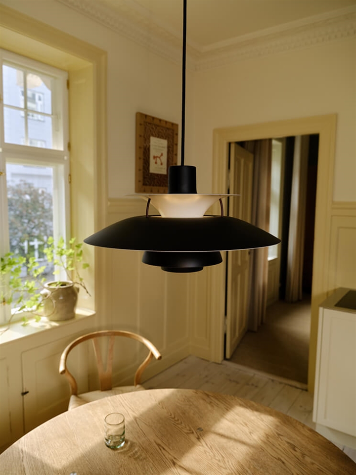 PH-lampenummeret refererer til lampeskærmenes størrelse. Derfor består PH 5 pendlen af en overskærm på ca. Ø50 cm.