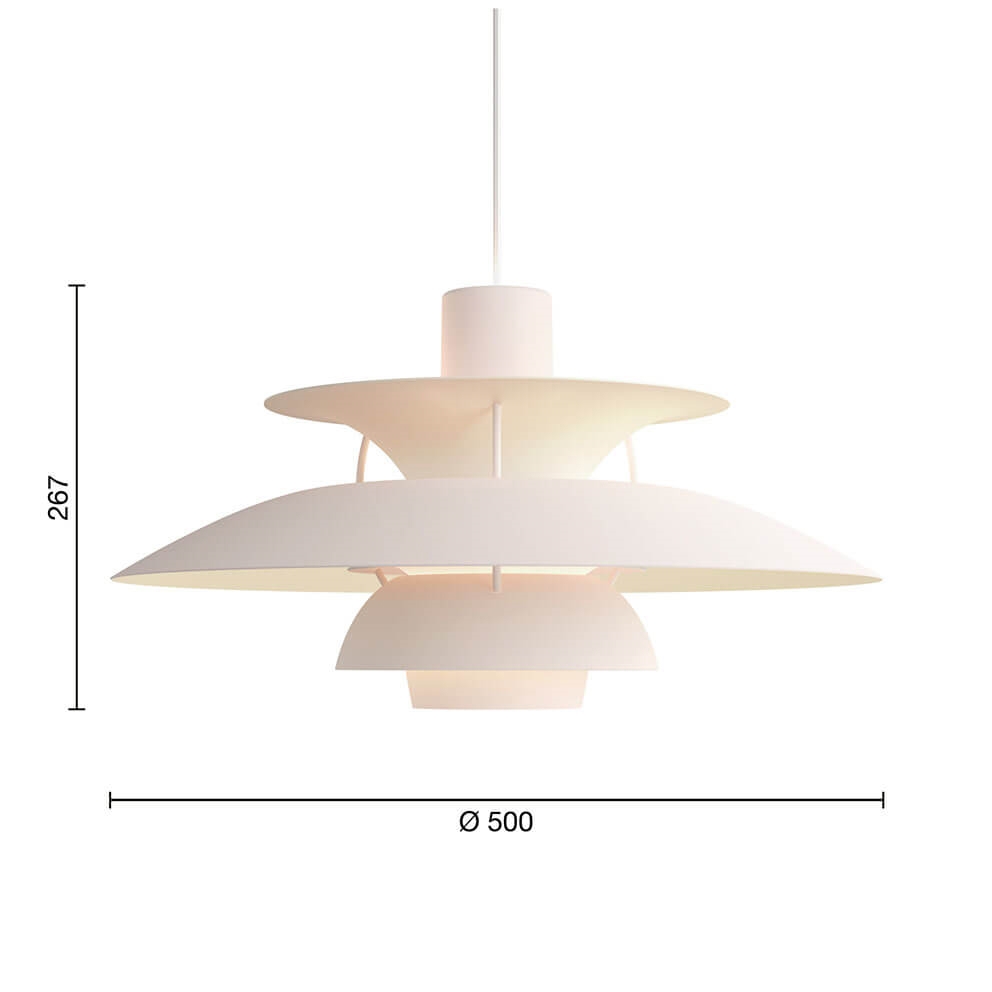 PH-lampenummeret refererer til lampeskærmenes størrelse. Derfor består PH 5 pendlen af en overskærm på ca. Ø50 cm.