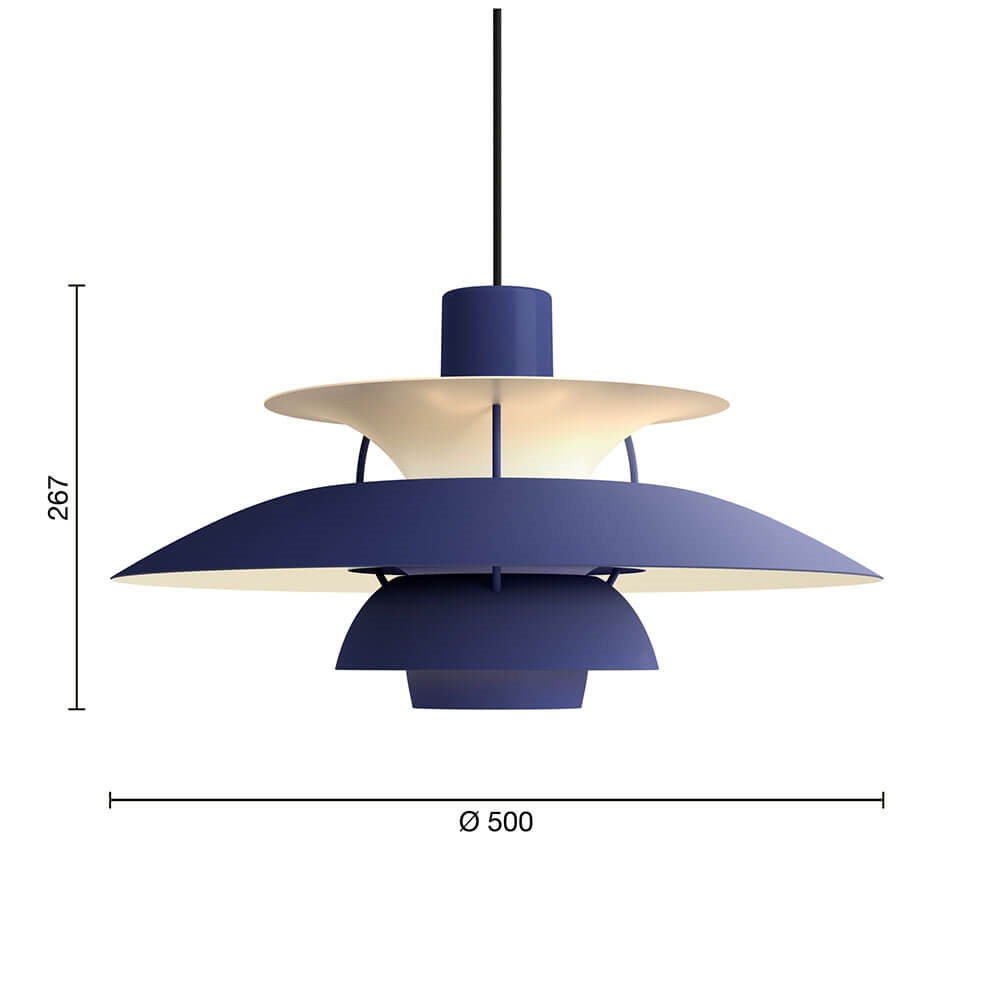 PH-lampenummeret refererer til lampeskærmenes størrelse. Derfor består PH 5 pendlen af en overskærm på ca. Ø50 cm.