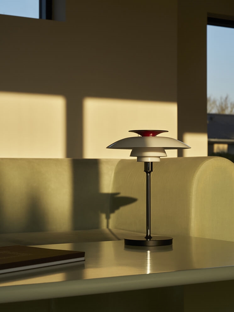 Den højglansforkromede batterilampe PH 80 Portable lanceret i 2025 er elegant nedskaleret fra det oprindelige design fra 1974 for at tilpasse den enestående lampe til nutidens indretninger. Den originale PH 80 blev skabt i året, hvor Poul Henningsen ville være fyldt 80 og er en raffineret hyldest til hans designarv. Det ikoniske treskærmssystem sikrer en fantastisk blændfri lysfordeling med både omgivende belysning og nedadrettet lys.